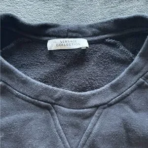 Classic black crewneck sweater by Versace. Features subtle logo detail. Ideal for stylish comfort. Used condition but still extremely wearable, has that nice worn in look. Fits snug.