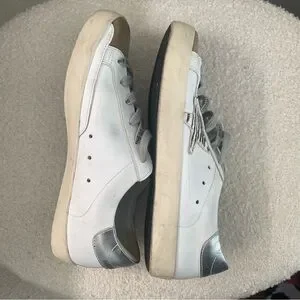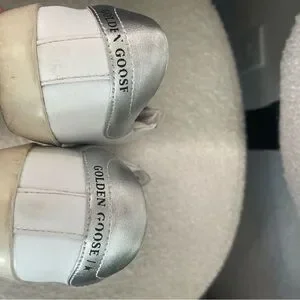 Chic Golden Goose sneakers. White body with silver heel. Brown toe adds a unique touch. Ideal for casual outings.