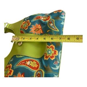 Stylish and colorful floral handbag in vibrant green, orange, red, and blue paisley design This bag features 3 interior compartments, and when open the middle section has a zip closure, interior pouches and pockets, and a zip panel on the back. Perfect for adding a pop of color to any outfit.