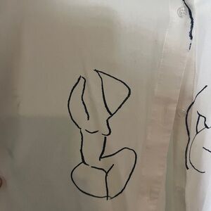 Cream button-down shirt with unique line art. Stylish and modern.