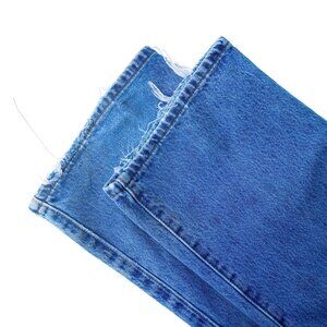 Distressing includes wear on the left thigh, fraying at one hem, and wear at the rear belt loops. Good worn‑in condition with character consistent with vintage Levi’s; see photos for details.