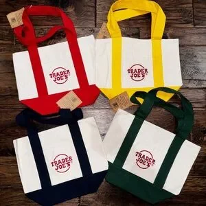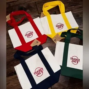Discover the vibrant Trader Joe's Mini Tote Bag Set, featuring bold red, yellow, green, and blue colors. Perfect for everyday use, these mini bags combine style and practicality.