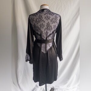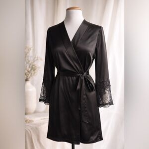 Victoria’s Secret black satin wrap robe with lace back detail and lace trim sleeves. Silky lightweight polyester with a soft satin finish.