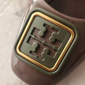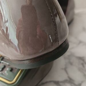 Chic gray flats with signature gold and green emblem. Perfect for versatile styling.