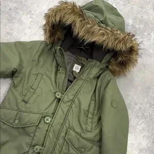 Chic GAP baby jacket in green. Features a cozy hood with faux fur trim. Ideal for cool weather.