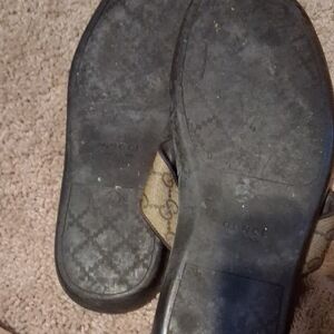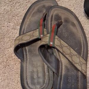 Elegant Gucci sandals with signature pattern. Features red and green striped accents.