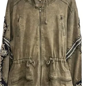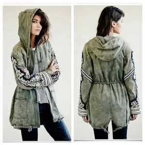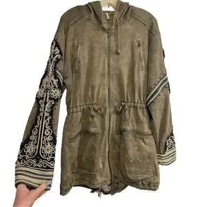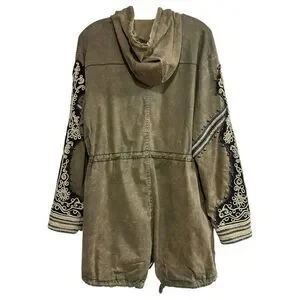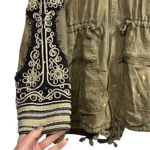 FREE PEOPLE Golden Quills Military Parka Jacket Coat Green Rhinestones M RARE
