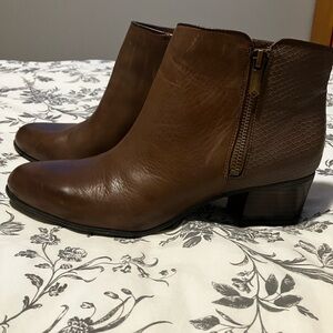 Elegant dark brown ankle booties. Sleek design with pointed toe. Versatile style. Please note that the boots are a snug fit & they feel more like an 8 1/2 - 9 size. I never wore them for that reason so they are brand new.