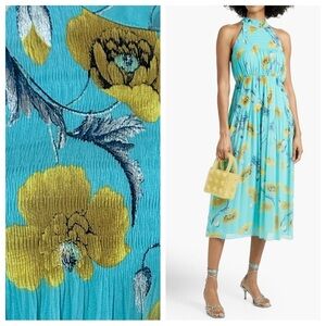 NEW DVF Lupin Floral-Print Plissé Chiffon Midi Dress Sz 6 Turquoise Floral