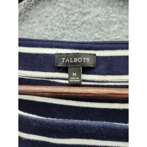 This Talbots dress showcases a timeless navy and white striped design, crafted from 100% cotton for breathable comfort. The ruffle sleeves add a touch of elegance to this chic piece.
