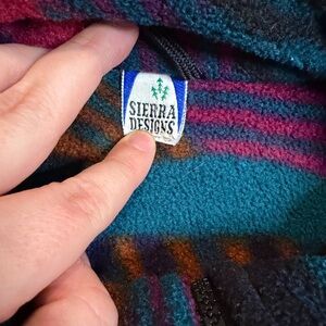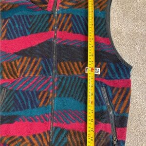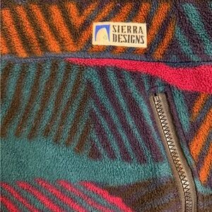 Stay cozy in this vintage Sierra Designs fleece vest, featuring a bold ’90s-style geometric pattern in teal, magenta, orange, and navy. Super soft, warm, and perfect for layering. Unisex style!