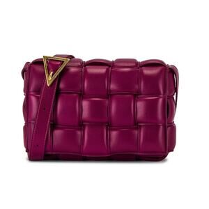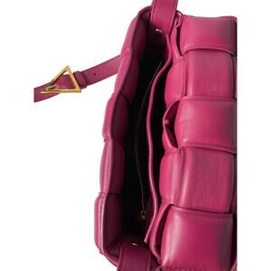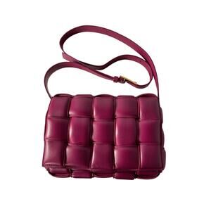 Bottega Veneta crossbody in padded woven leather finished in purple with gold tone hardware. This garment features features a magnetic flap closure and an adjustable shoulder strap.