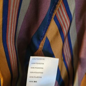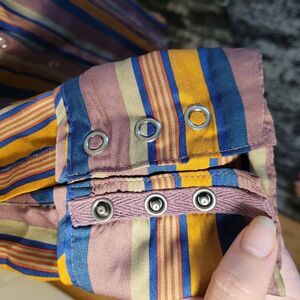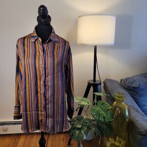 Originally $98, silky soft, satin, light weight, 70's pattern, multi, chic, vibrant colors, We The Free, Free People Top, striped top, long sleeve top, collared top, snap button closure high-low hem, spread collar, retro, Long sleeves, Snap cuffs, Snap front closure, High-low contour hem, boho, cottage, streetwear