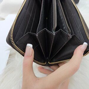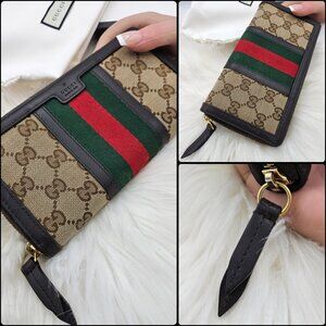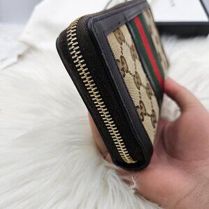 Ophidia zip around long wallet in beige and dark brown supreme canvas with green and red Web stripe.