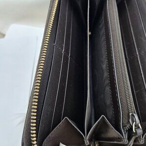 Zipped closure that pens to a brown leather interior with card slots, a zipper compartment, and patch pockets for convenient storage.