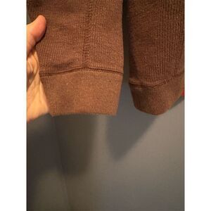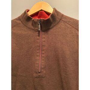 This Tommy Bahama men's large pullover sweater is designed for casual occasions and is perfect for fall. It features a reversible design with brown and maroon colors, a 1/4 zip, and long sleeves. Made from soft, durable fabric, it offers a regular fit and is machine washable. Ideal for casual outings or relaxed gatherings. The sweater is pre-owned with normal wear and no tags.