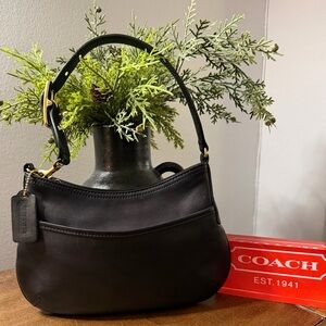 This Coach Legacy Demi West Bag is crafted in black glove tanned leather. The interior is lined in a soft brown fabric and features the Coach logo throughout. There is an interior zippered pocket to hold your small essentials. The exterior features a slip pocket on the front which is perfect to hold your phone, keys, etc. The strap is adjustable. If you wish to make it longer, you have the option of adding a bag extender.