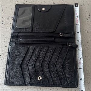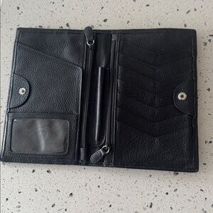 Interior holds up to 8 credit cards, clear ID slot, passport sleeve, 2 slip pockets, 2 zip pockets and pen holder.
