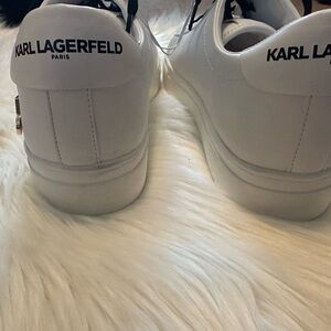Stylish white sneakers with black laces. Features playful embellishments. Comfortable and trendy design.