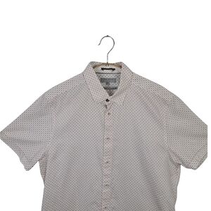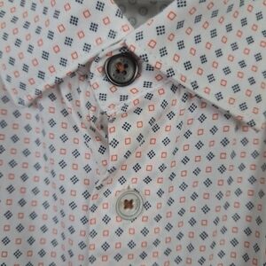 Consists of small, structured hexagon or diamond-like motif. These clusters are typically composed of black and burnt orange/red elements on a light cream or white background. This pattern is often described as a foulard or pixelated design commonly used by Ted Baker.Elevate your style with this classic white patterned shirt. Perfect for any occasion, this shirt offers both comfort and elegance.