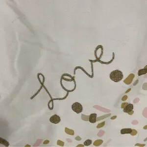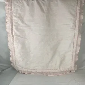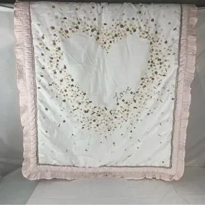 Adorable Lambs & Ivy baby blanket featuring a soft white satin center with a pink and gold confetti heart design and embroidered “love” detail. Finished with a beautiful light pink ruffle trim.