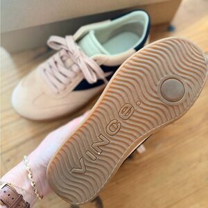 Chic blush sneakers with bold navy stripes. Ideal for everyday style.