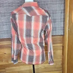 Classic Wrangler Rustler shirt. Features a bold plaid pattern. Red and brown tones. Comfortable and stylish.