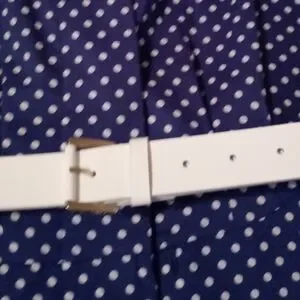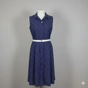 Step out in classic Americana style in this timeless Tommy Hilfiger shirt dress. In cool breezy 100% cotton. Navy with white polka dots accented with front pockets and a white faux leather belt. Flattering A-line silhouette goes everywhere, from office to a weekend brunch.