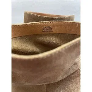 The Lucky Brand Boots are stylish women's ankle booties in size 9.5. Featuring a peep toe design with a high block heel, these brown suede boots are perfect for casual occasions. The slip-on style with studded accents adds a trendy touch to the booties, making them suitable for going out, a bohemian look, or for a city vibe. With a comfortable insole made of fabric and a polyurethane outsole, these Lucky Brand ankle booties are both fashionable and practical for all seasons. One tiny spot on the back as shown in photo.