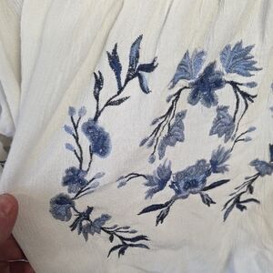 Stylish off-shoulder blouse with blue floral embroidery. Ideal for casual outings.