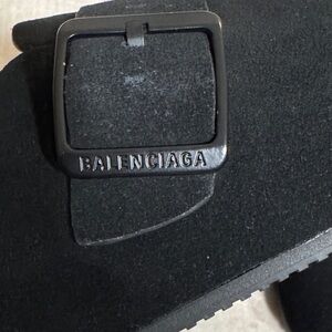 Minimalist matte black design with adjustable buckle strap and Balenciaga logo detailing. Lightweight molded construction with textured outsole for grip.