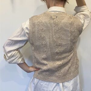 Really nice crochet beige vest with buttons made in Canada. Condition is good, size fits like a small medium, it’s not a tight fit. Model is 5’7, 130 lbs. There is stretch to the fabric. Not sure what is the fabric. Length from the shoulder ; 54 cm Style: cableknit crochet old school collegiate