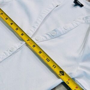 A mixed material bodysuit complete with long puff sleeves and a henley neckline.