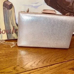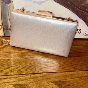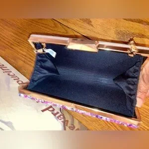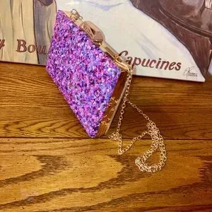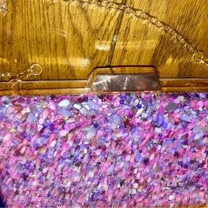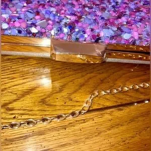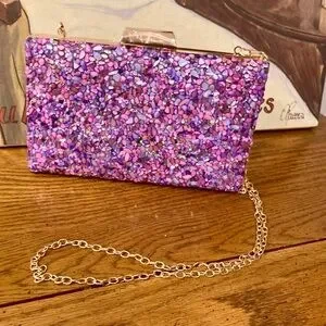 Bag is adorned with pebbles of pinks and purples bd rhinestones. Can be carried with the crossbody chain. Or remove the chain to carry as a clutch. Roomy enough for a phone and more.