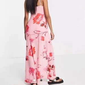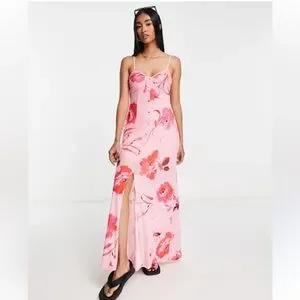 Chic pink maxi dress with vibrant floral design. Features a stylish slit and spaghetti straps. Ideal for warm days. Worn once. From non smoking home.