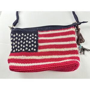 Authentic The Sak crochet crossbody bag featuring a bold American flag design.