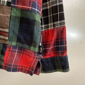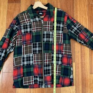 Stylish plaid shirt jacket by Stussy. Features a mix of red, green, and brown. Ideal for layering.