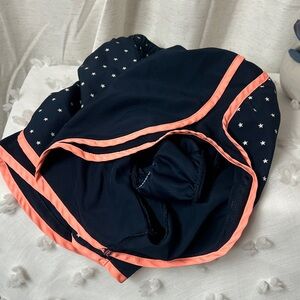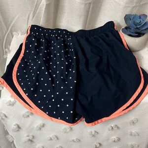 Navy shorts with coral trim. Star pattern on one side. Perfect for workouts.