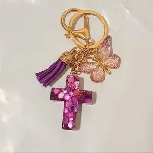 Elegant keychain featuring a purple cross and gold butterfly charm. Perfect for adding a touch of style to your accessories.