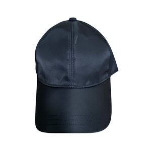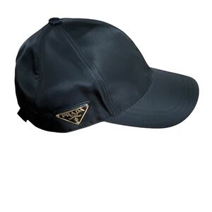 Sophisticated black cap by Prada. Features iconic logo detail. Perfect for stylish outings.
