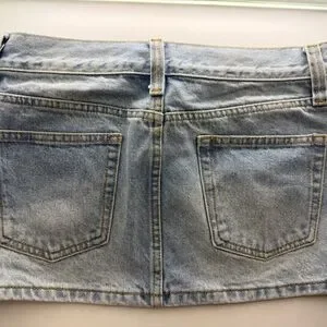 Trendy light blue denim mini skirt. Features a classic pocket design. Ideal for everyday style.