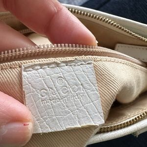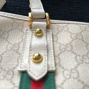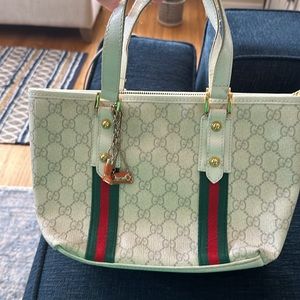 Stylish Gucci tote with iconic pattern. Features cream and green colors. Red and green stripe detail. Gold hardware accents.