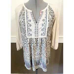 Vintage America Boho Peasant Top Sz M Tan 3/4 Sleeve Embroidered Floral