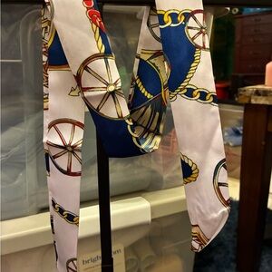 Vibrant silk scarves with chain and rope patterns. Includes red, pink, black, cream, and blue designs.