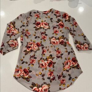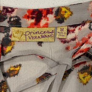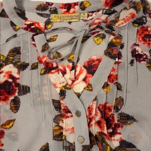 Chic floral blouse by Vera Wang. Features vibrant red flowers on a gray background. Ideal for stylish outings.