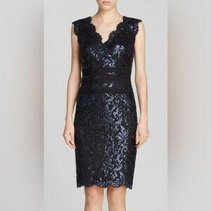 Tadashi Shoji Embroidered Sequin Lace Banded Navy Black Sheath Cocktail Dress