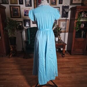 Vintage 70s Blue Dress Lace Trim Maxi Short Sleeve Wrap Housecoat Belted