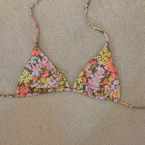 Vibrant floral bikini top by Billabong. Features pink, yellow, and brown floral pattern. Perfect for beach days.