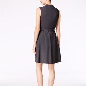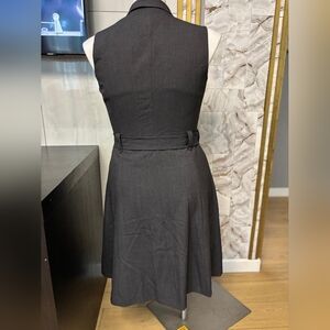 Chic mini dress with a wrap design. Features a charcoal body and black accents. Ideal for stylish outings.