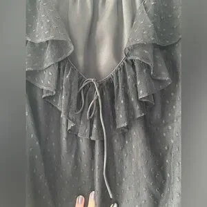 Sleeves are sheer, textured polka dot print, ruffle neckline with a bow